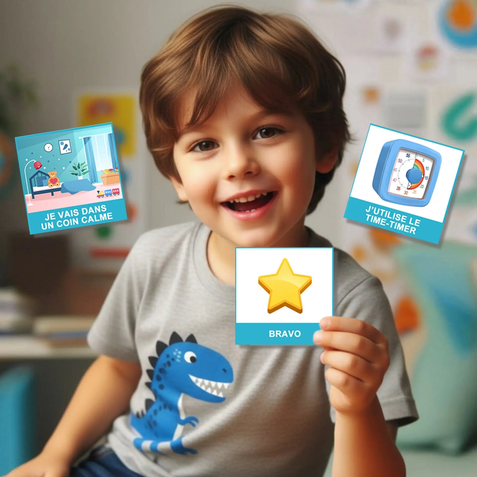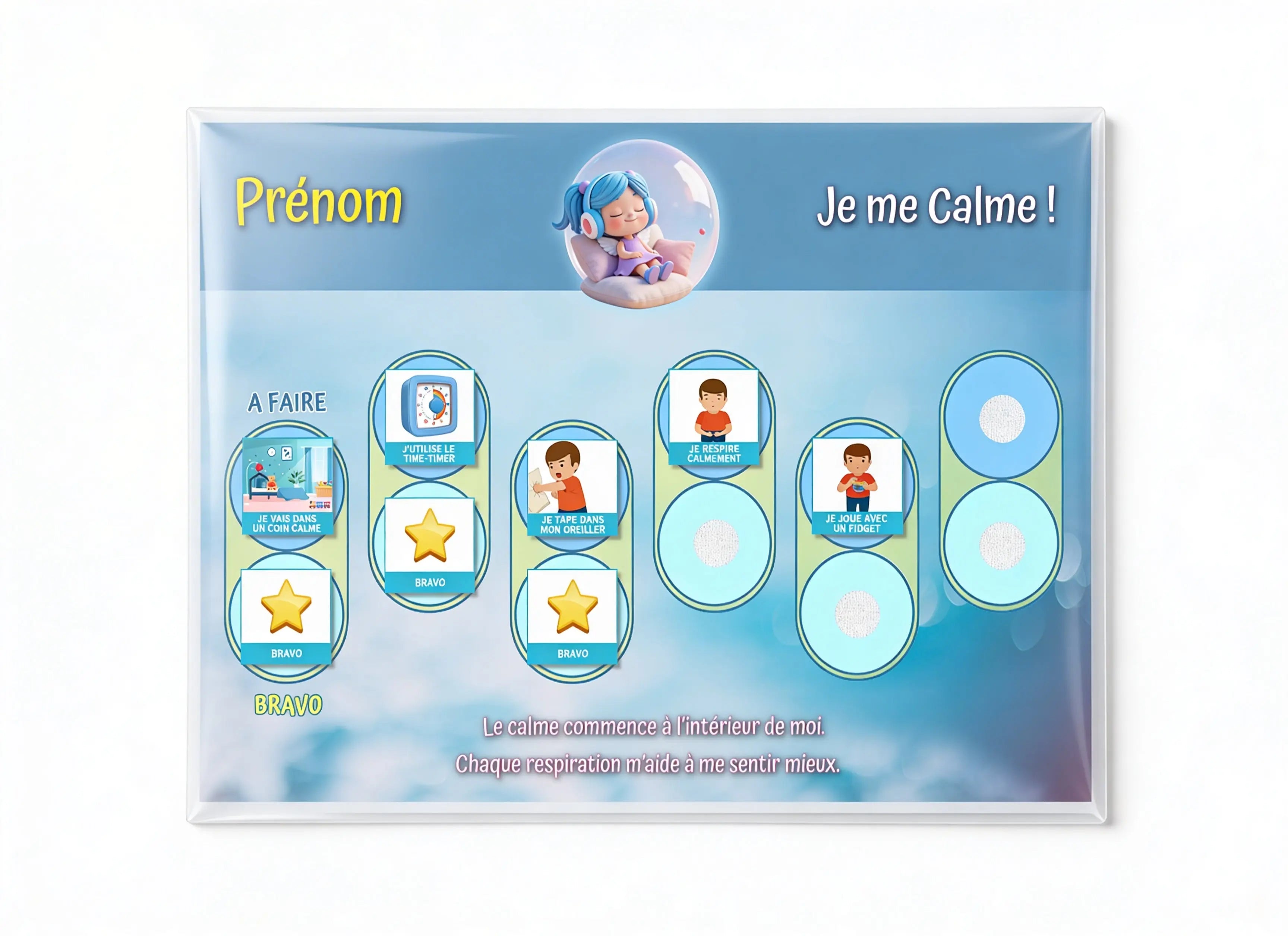 Grâce à ses pictogrammes visuels, son système de validation par étoiles et ses récompenses, il permet à l’enfant d’apprendre à se calmer, se réguler et reprendre le contrôle de ses émotions, dans un cadre sécurisant et bienveillant.