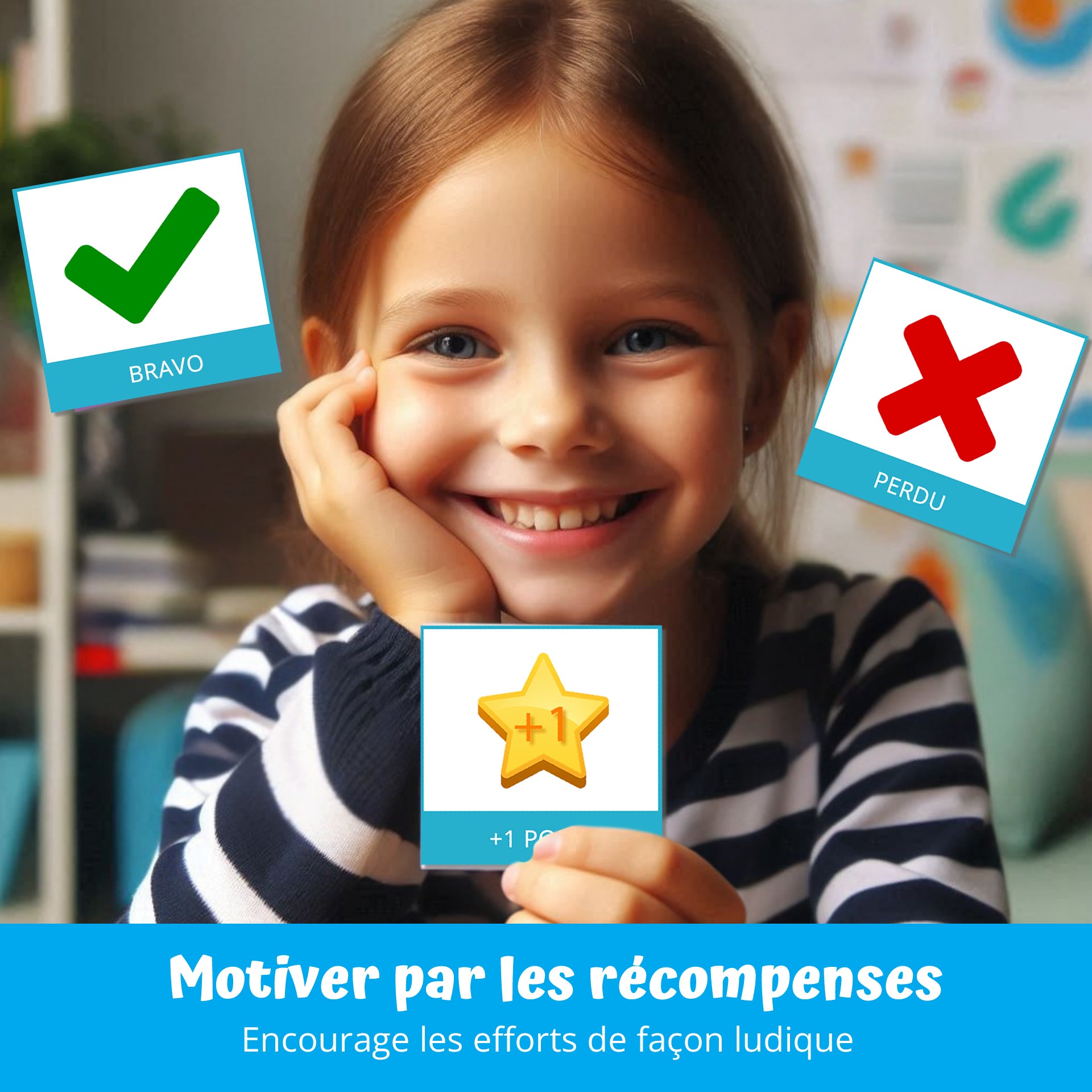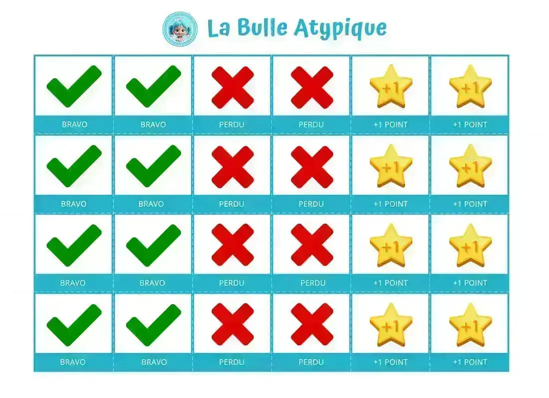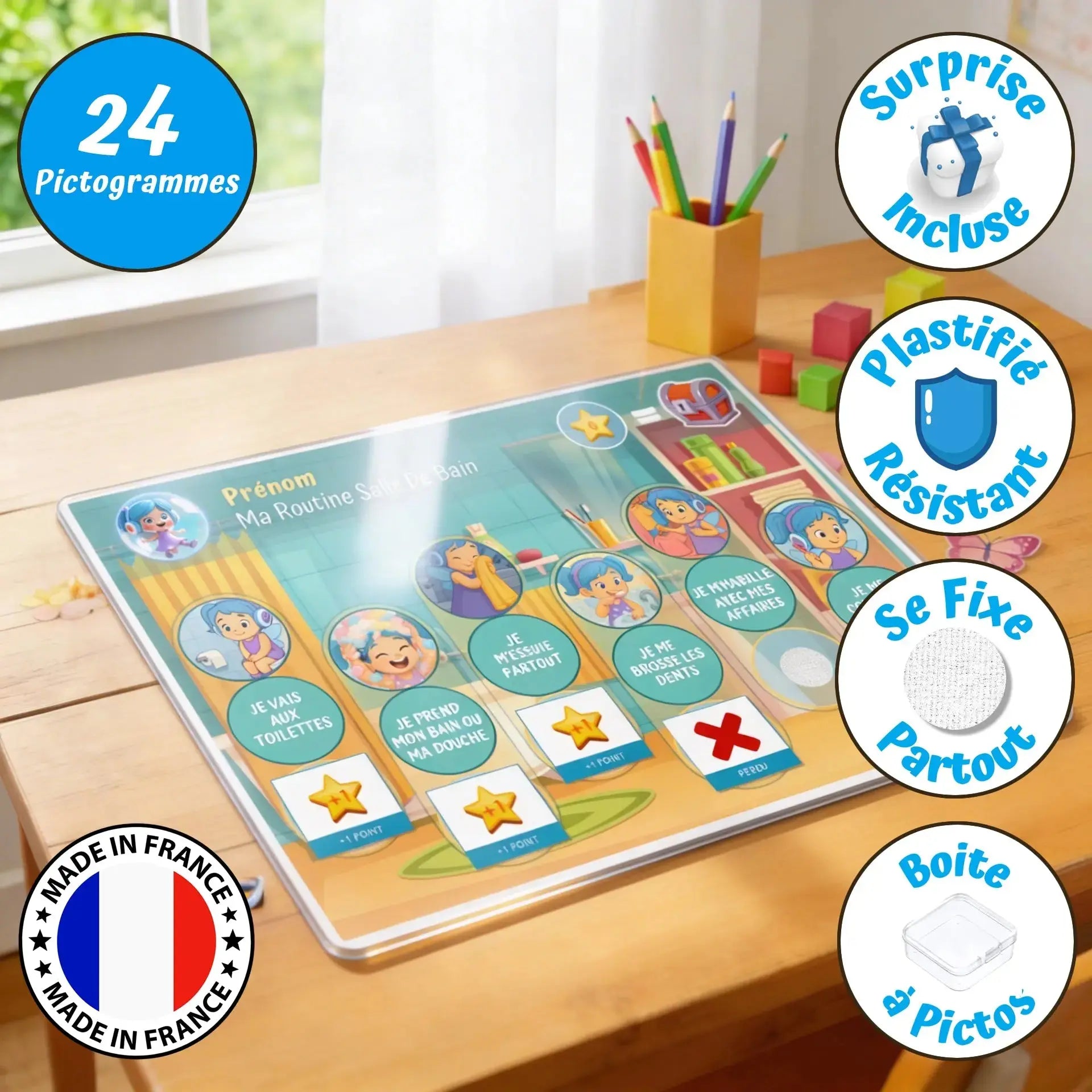 Lecture facilitée : Pictogrammes sur fonds contrastés pour une reconnaissance immédiate par l'enfant, même s'il ne sait pas encore lire.